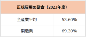 上記の表からもわかるように、製造業はむしろ正規雇用の割合が高い業界です。